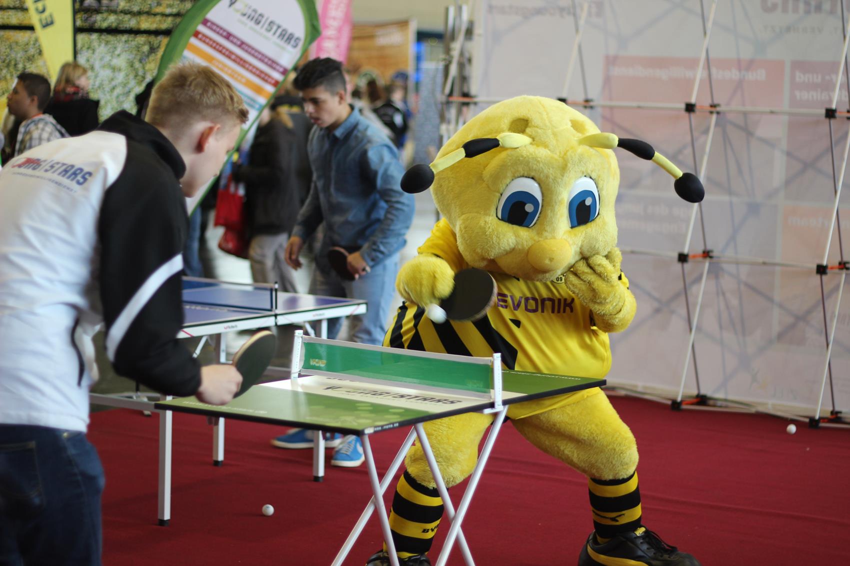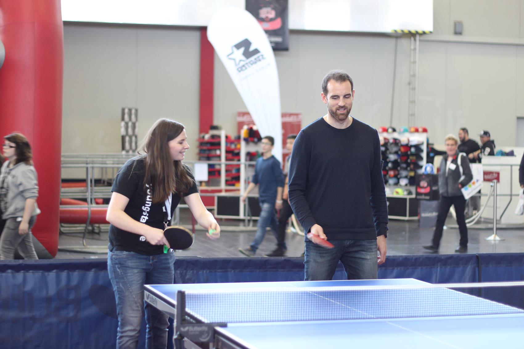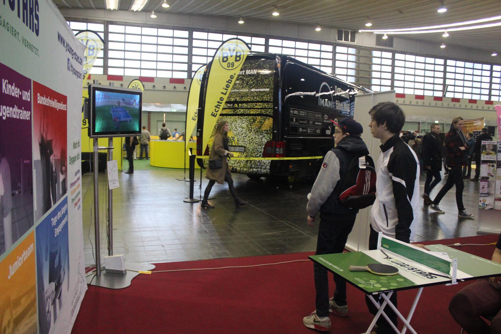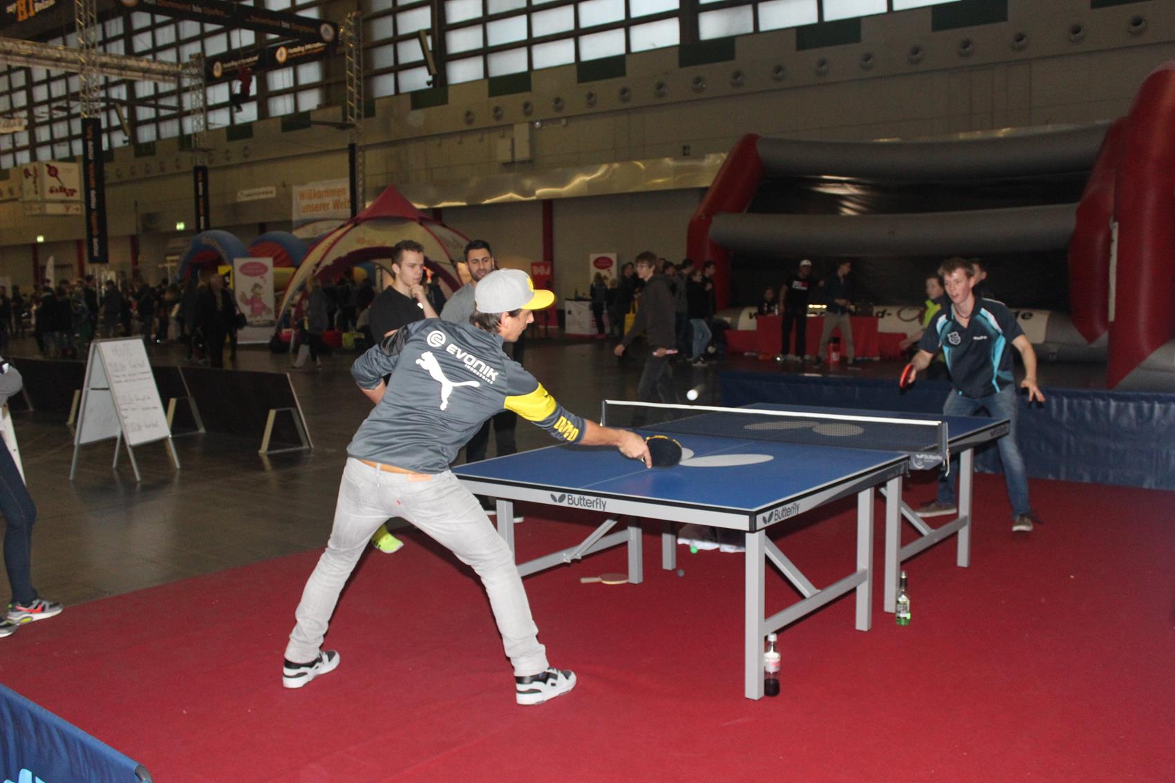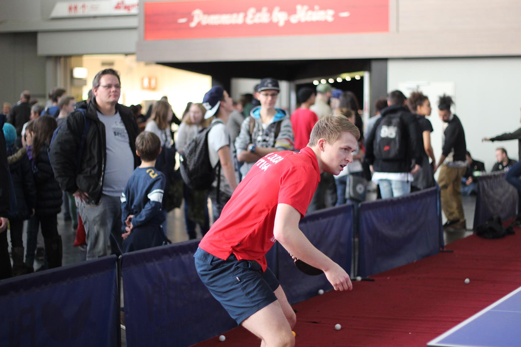 Mehr als zehn Tische zum freien Spielen, ein Parcours mit Geschwindigkeitsmessung oder einem Duell gegen die Wii, Mini-Turniere, Schaukampf und vieles mehr – am Stand zwanzig in Halle vier war eigentlich für jeden Jugendlichen etwas dabei. Kein Wunder, dass viele sich ein Schläger oder eine Pfanne nahmen, und ein paar Minuten Tischtennis spielten – auch absolute Promis wie Ex-Nationalspieler Christoph Metzelder oder dem BVB-Maskottchen Emma. Ihr wahres Tischtennis-Können konnten die in der Regel Hobby-Spieler im Parcours unter Beweis stellen. Wer sich bei der Geschwindigkeitsmessung, beim Zielschießen, am Mini-Tisch, an der Wii und beim TT-Quiz beweisen konnte, wurde auch mit einem Preis belohnt.